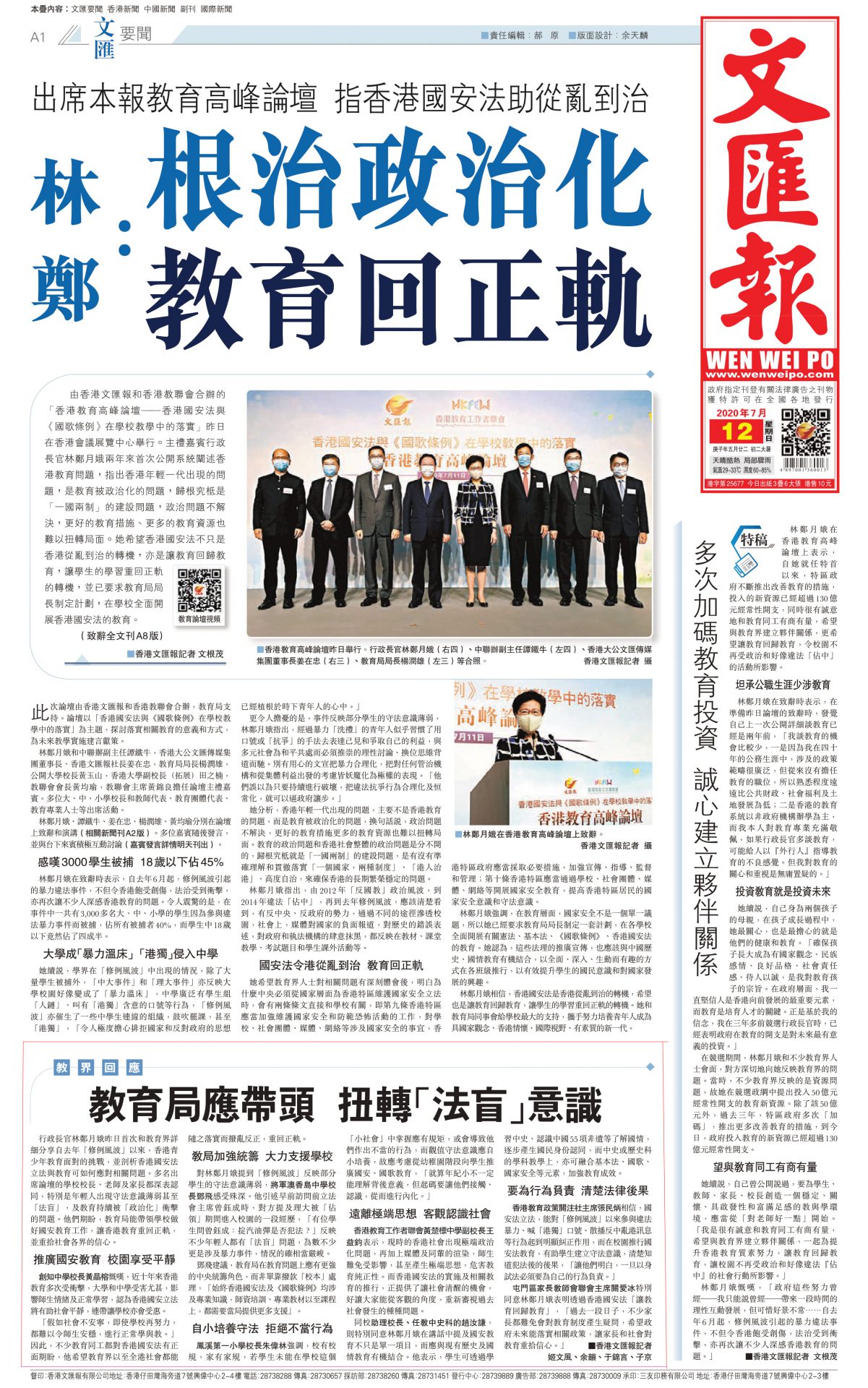 我校副校長王益鈞、助理校長趙汝謙就「國家安全教育」建言獻策(文匯報A1頭版 7月12日)