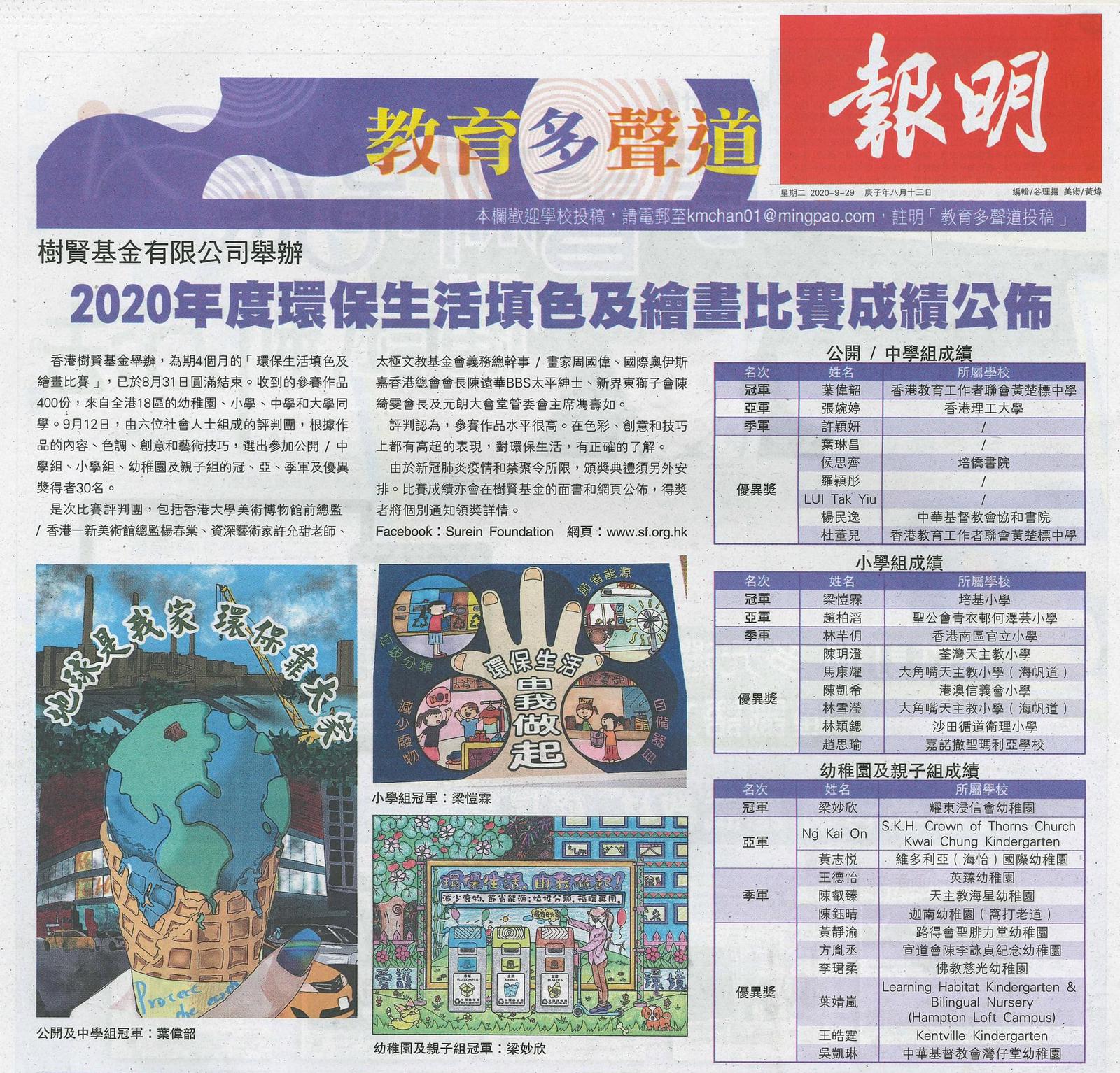 我校4A葉偉韶同學與3A杜董兒同學榮獲環保生活繪畫比賽公開組冠軍及公開組優異獎(明報 2020-09-29)