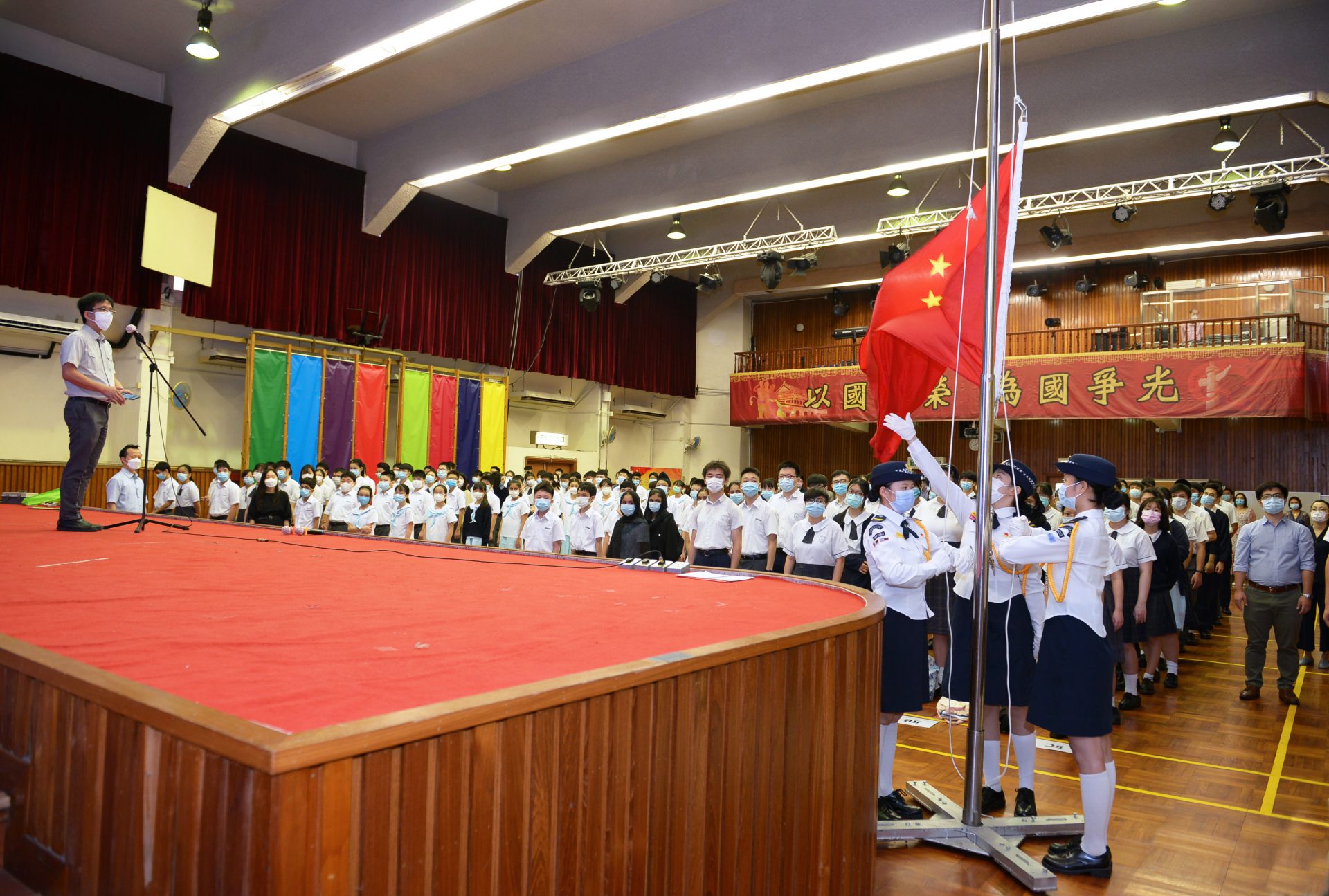 升旗隊進行升旗儀式,全體師生向國旗行注目禮(一)