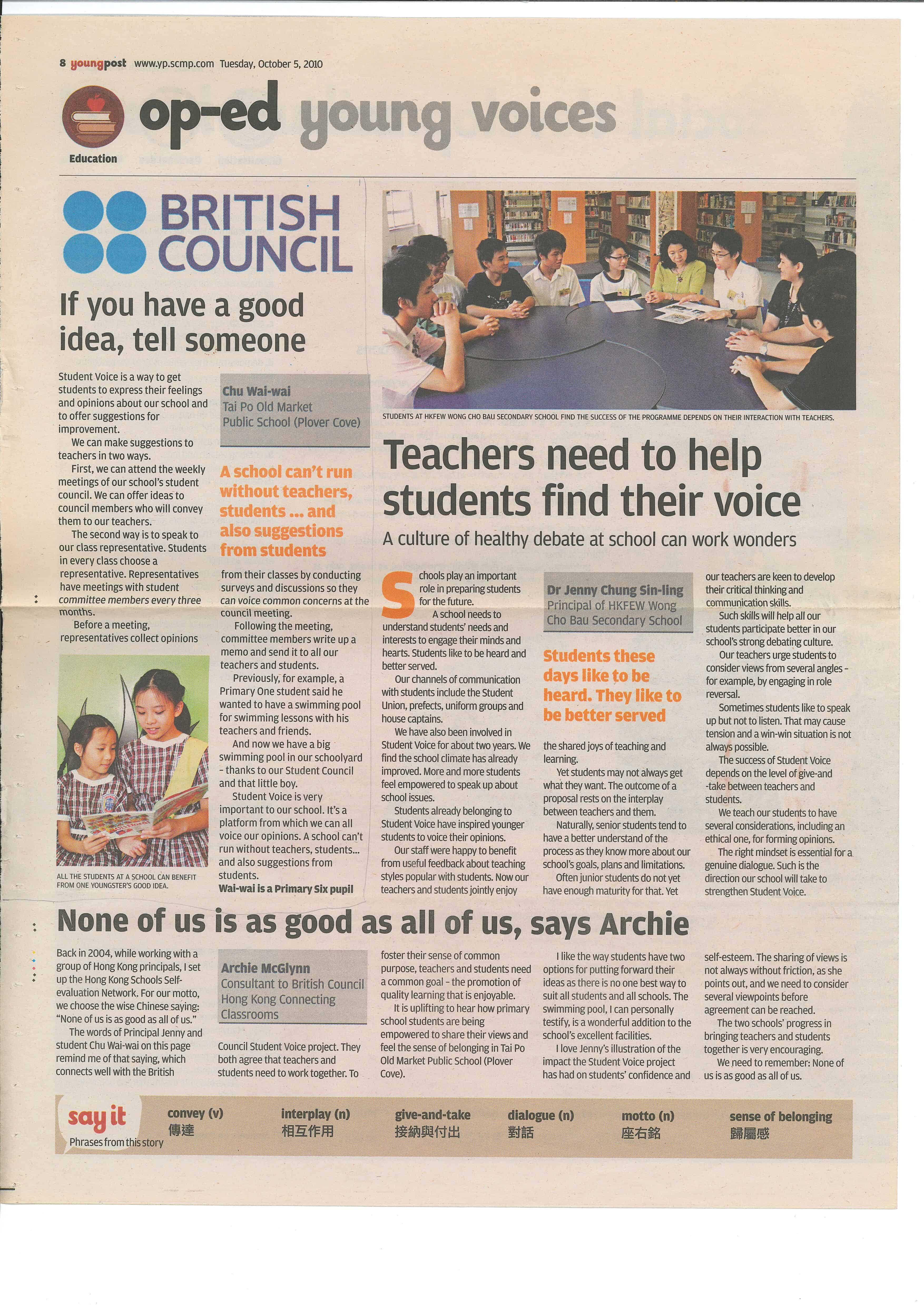 Teachers need to help students find their voice (South China Morning Post, October, 5, 2010)