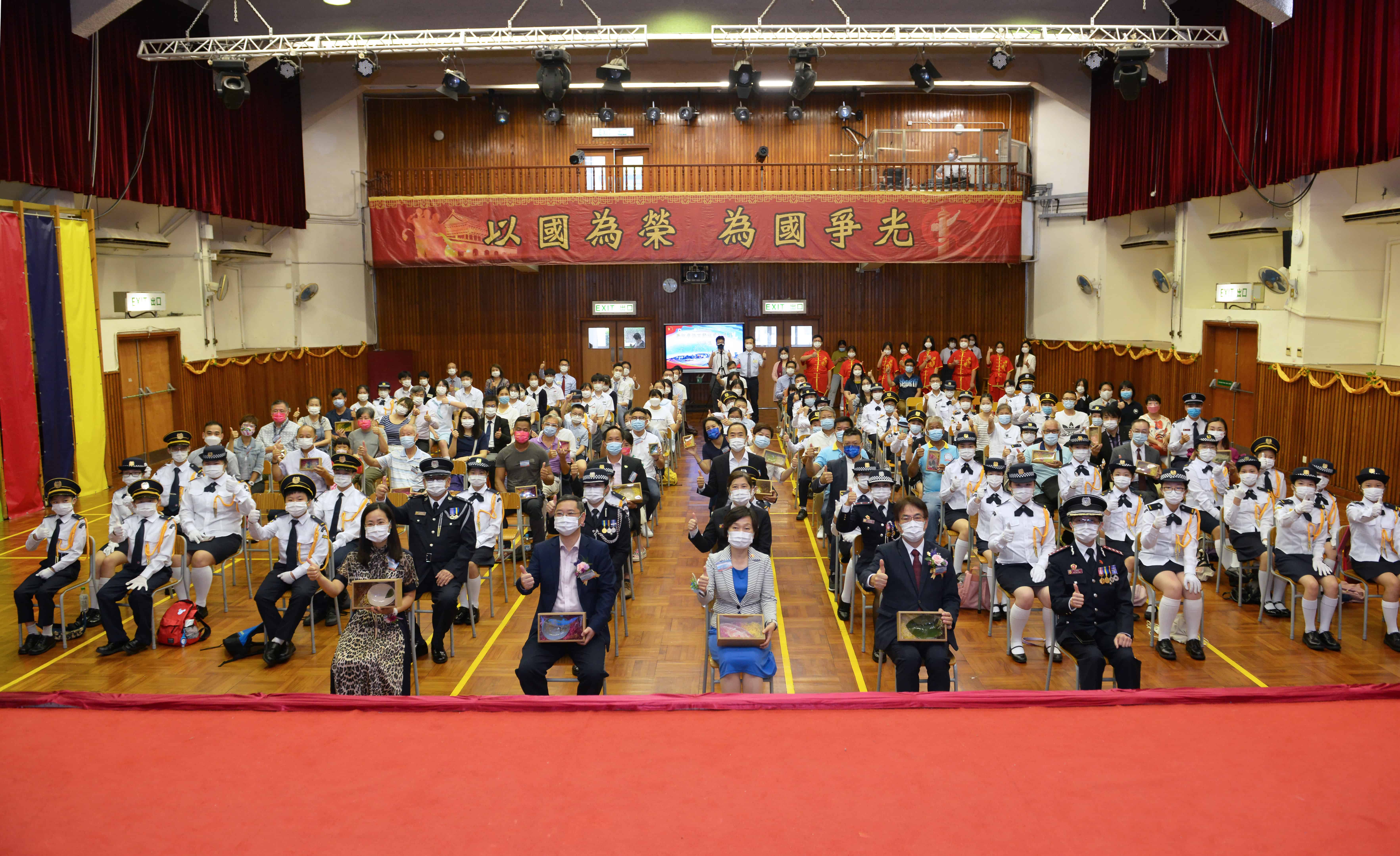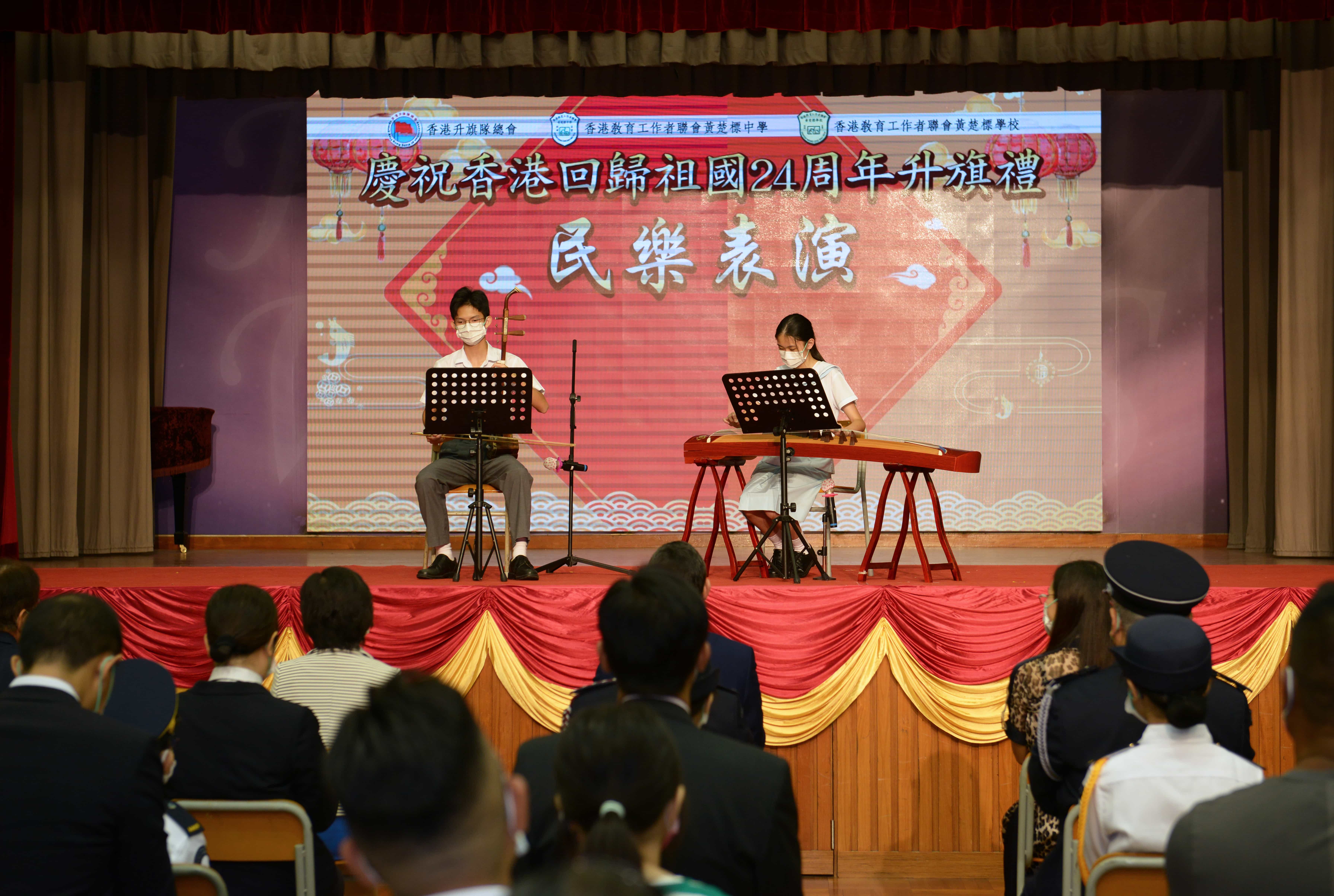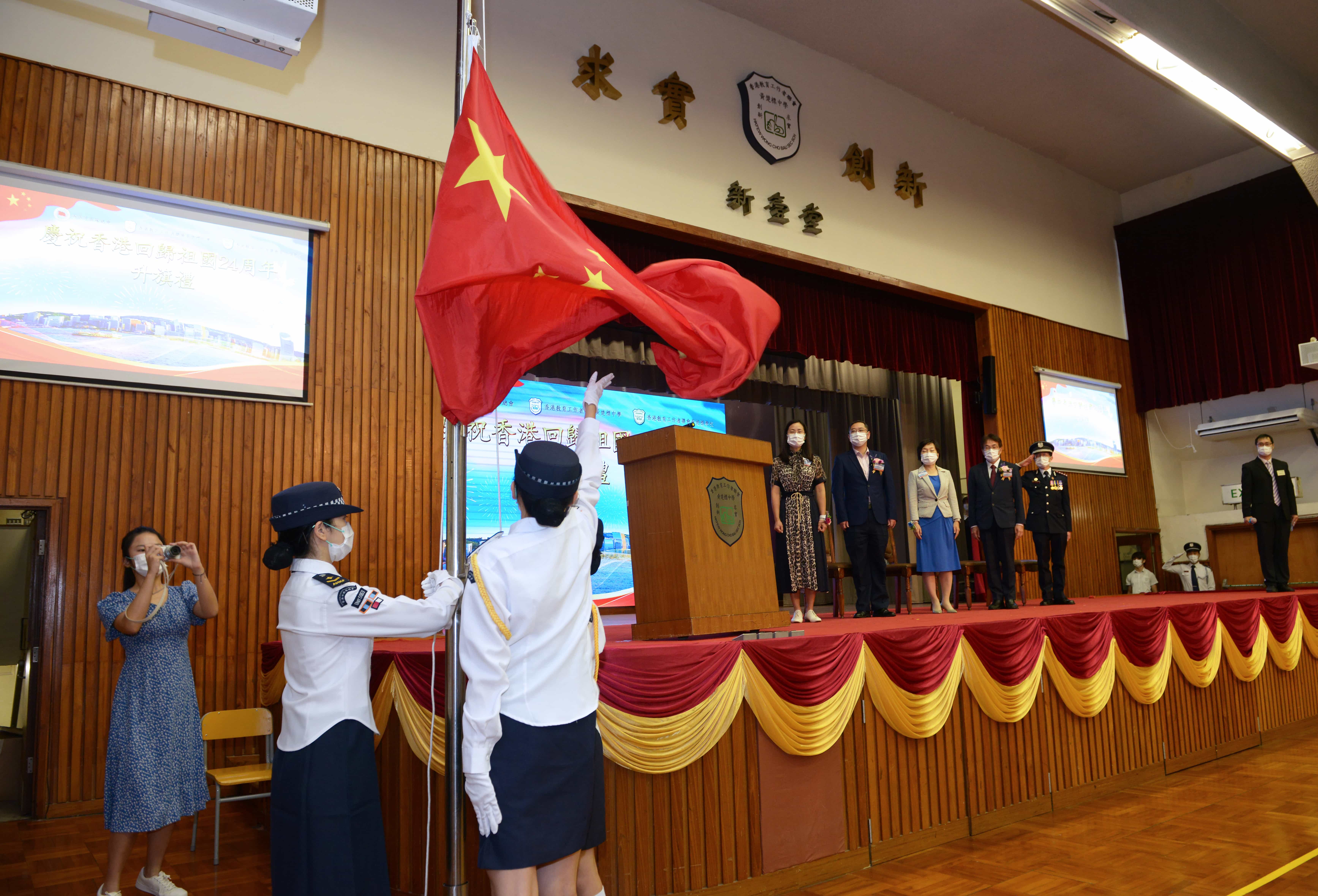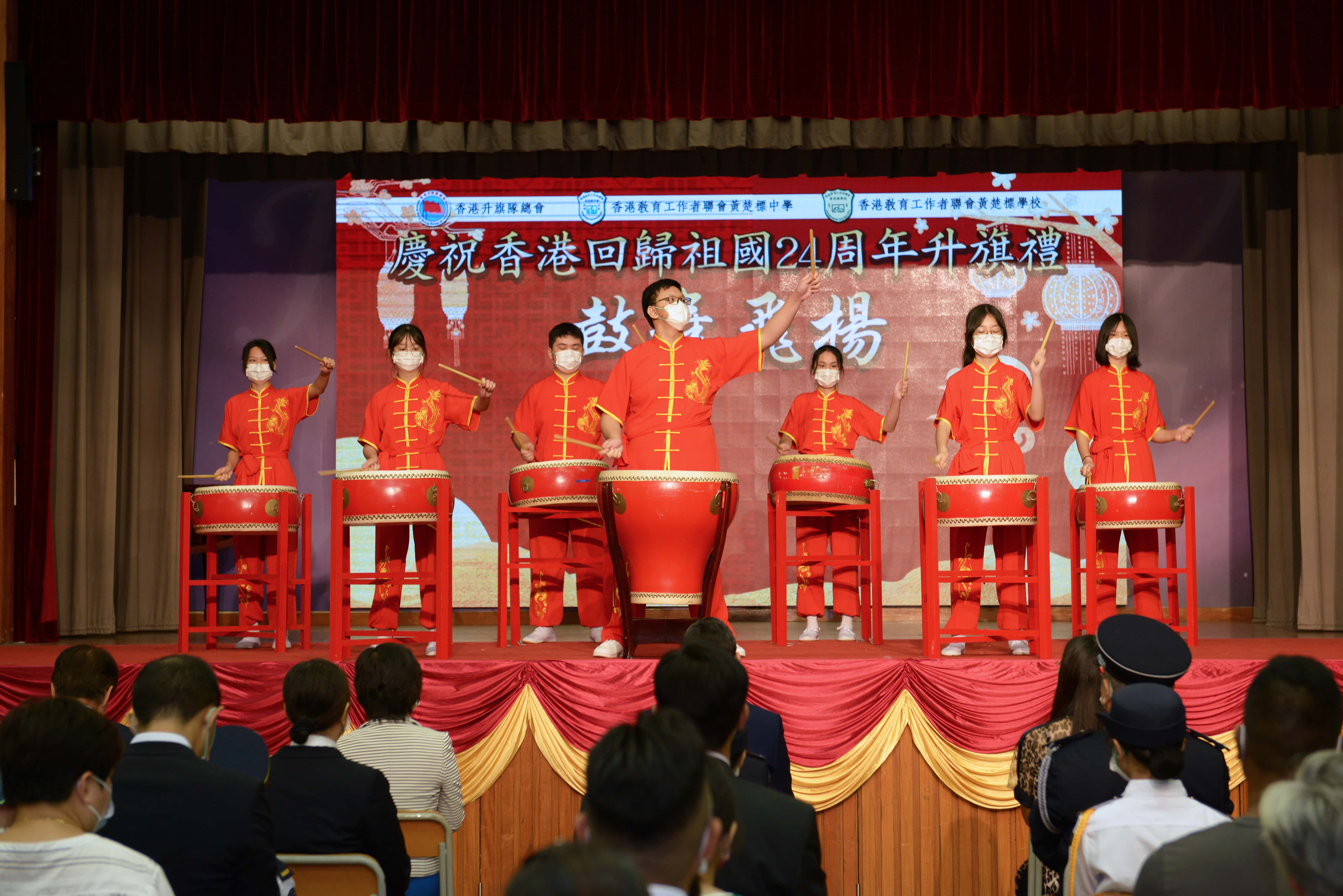 隨著鼓聲響起,升旗隊浩浩蕩蕩進場,進行升旗禮儀式。在國歌的奏樂下,國旗冉冉升起,場面莊嚴肅穆,在座眾人共同感受回歸的歡慶時刻。主禮嘉賓黃均瑜太平紳士致辭,回顧百年以來,中國人憑藉自身的努力,克服種種困難,逐步把國家建設成今天的小康社會。他又表示,現在國家仍然需要面對各種挑戰,因此國家安全尤為重要,勉勵年青人要致力維護國家安全及人民利益,共同展望建國百年時的盛世風光。許振隆校長則表示中國在這一百年間,在各方面取得長足的發展,國家正值壯年,勉勵年青人一起貢獻青春的力量,建設國家。
