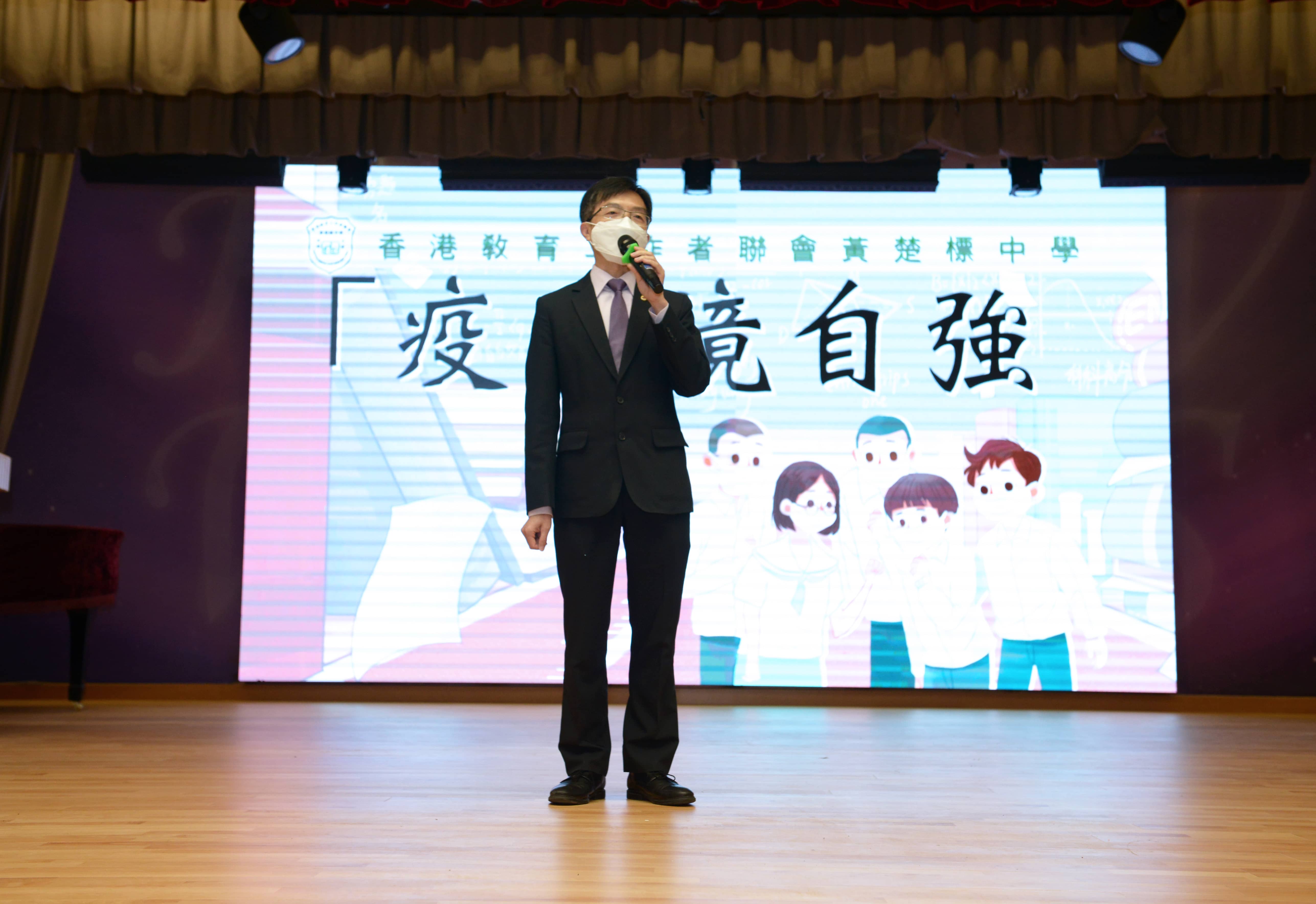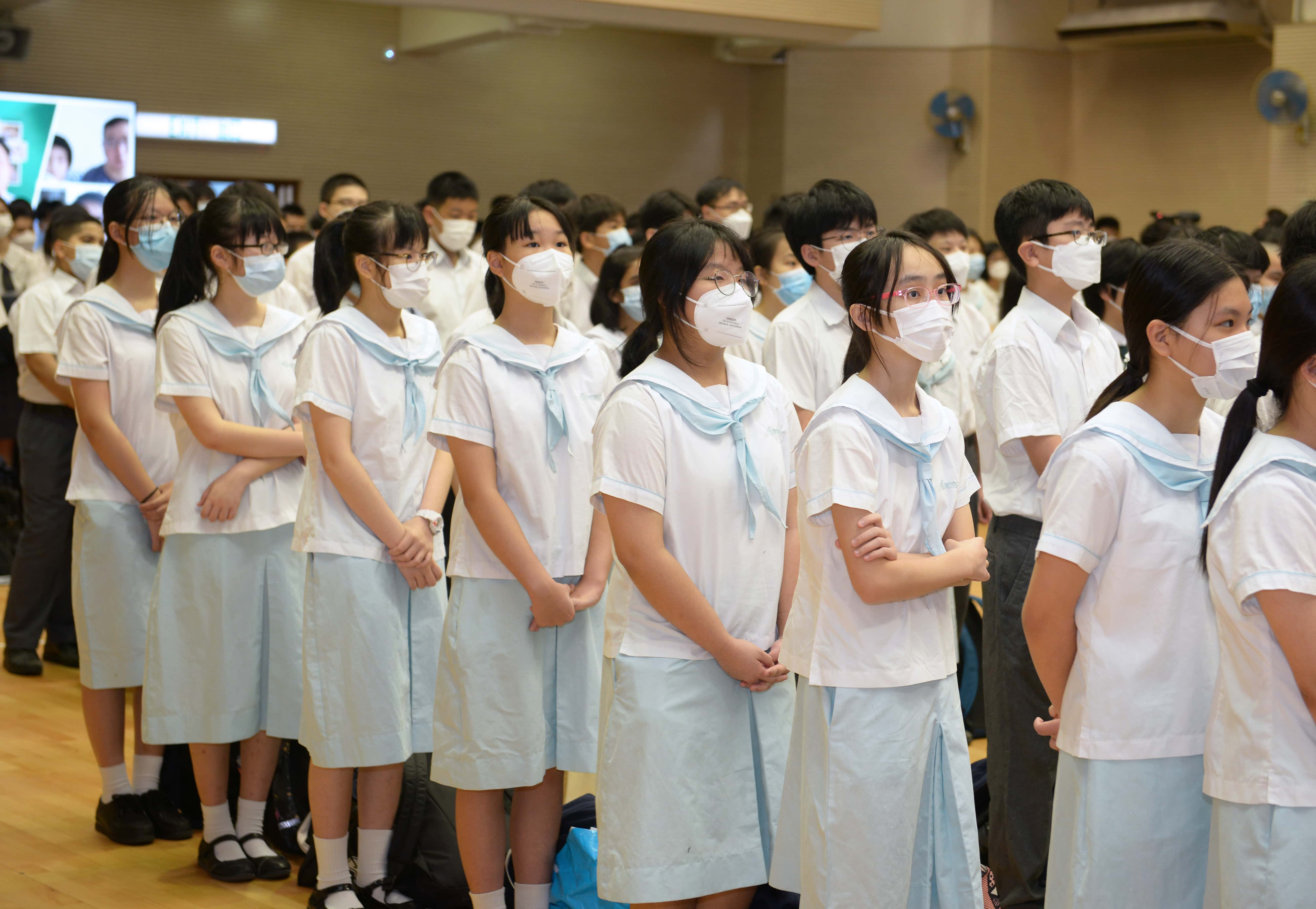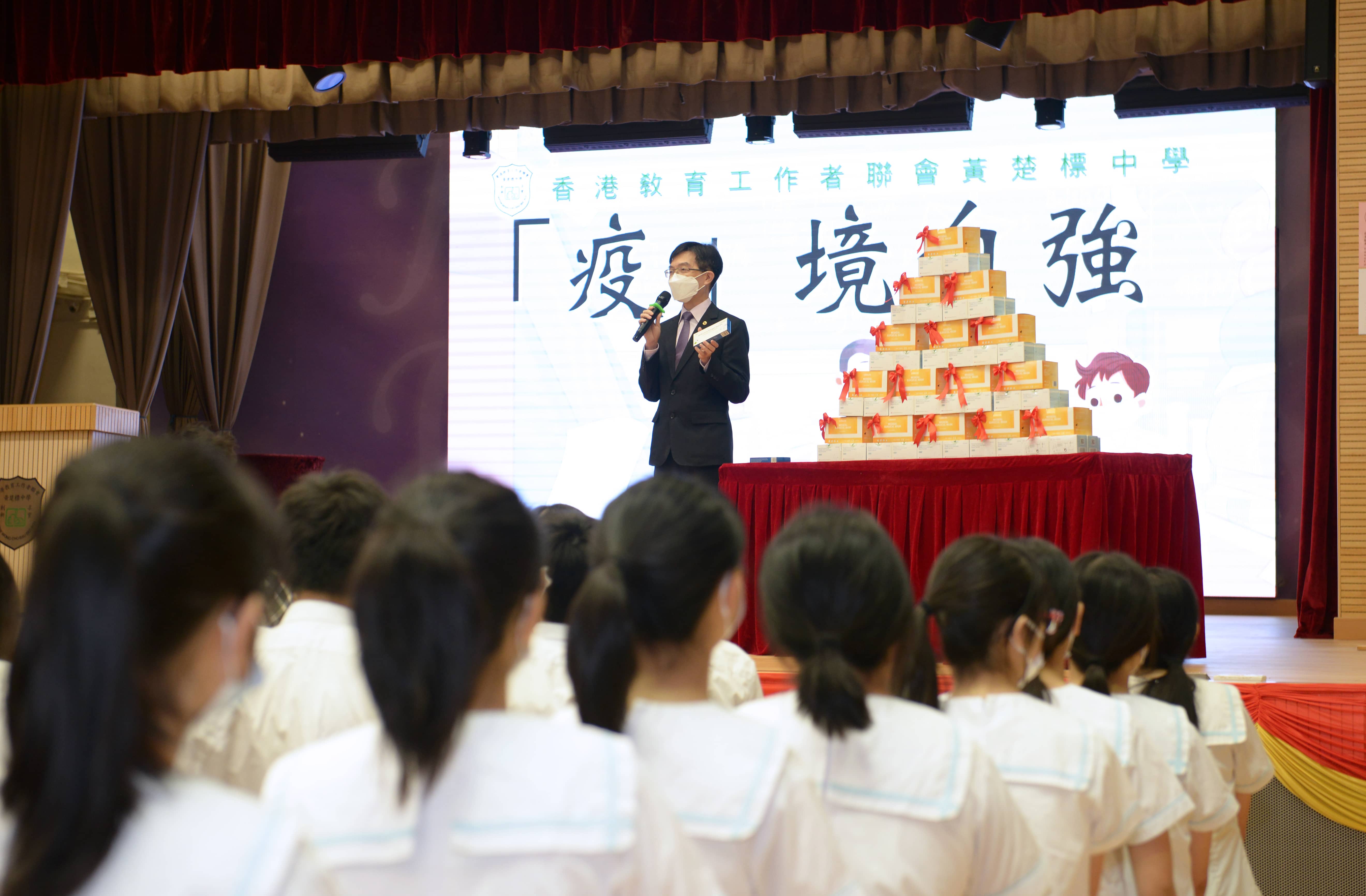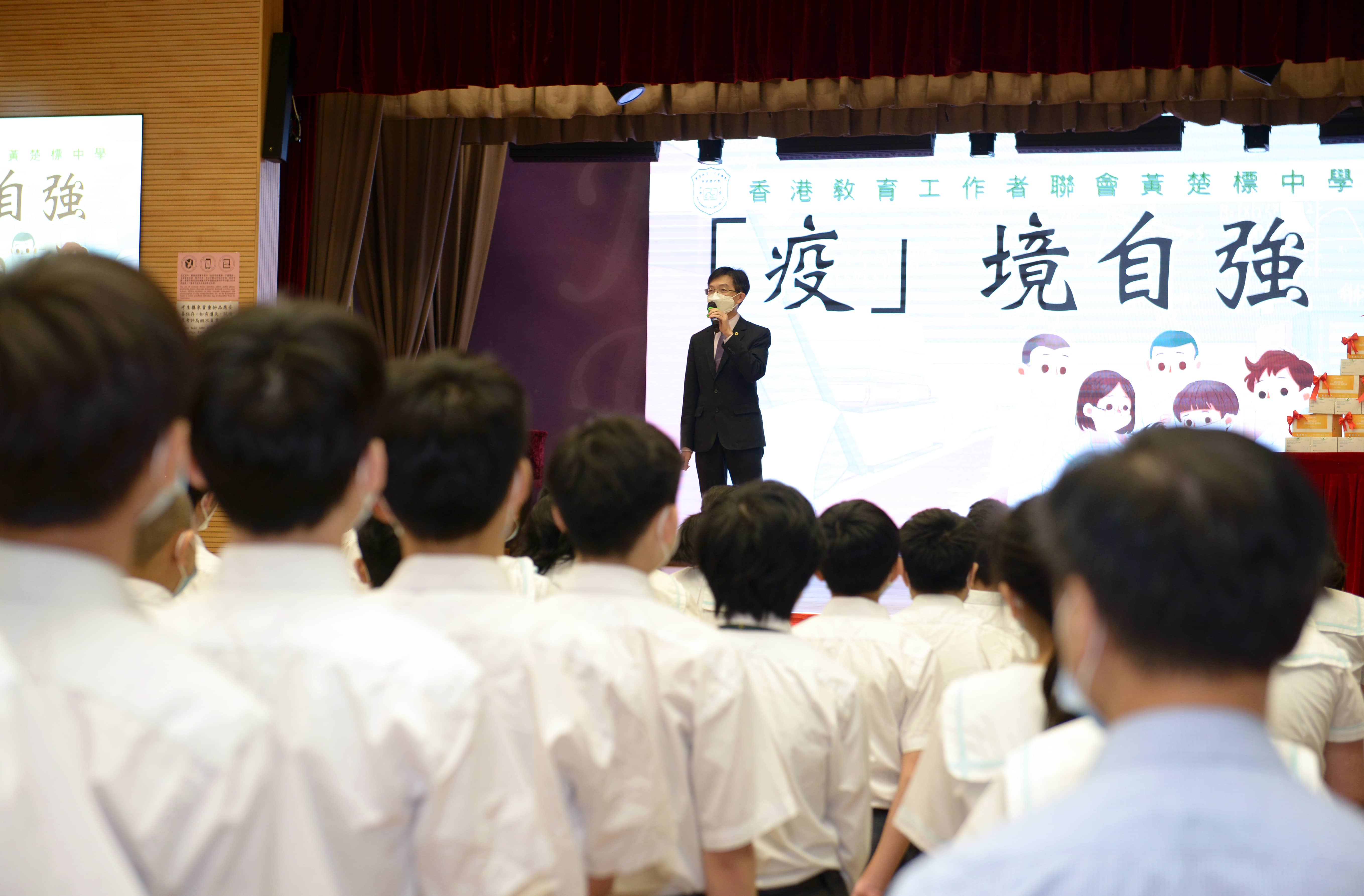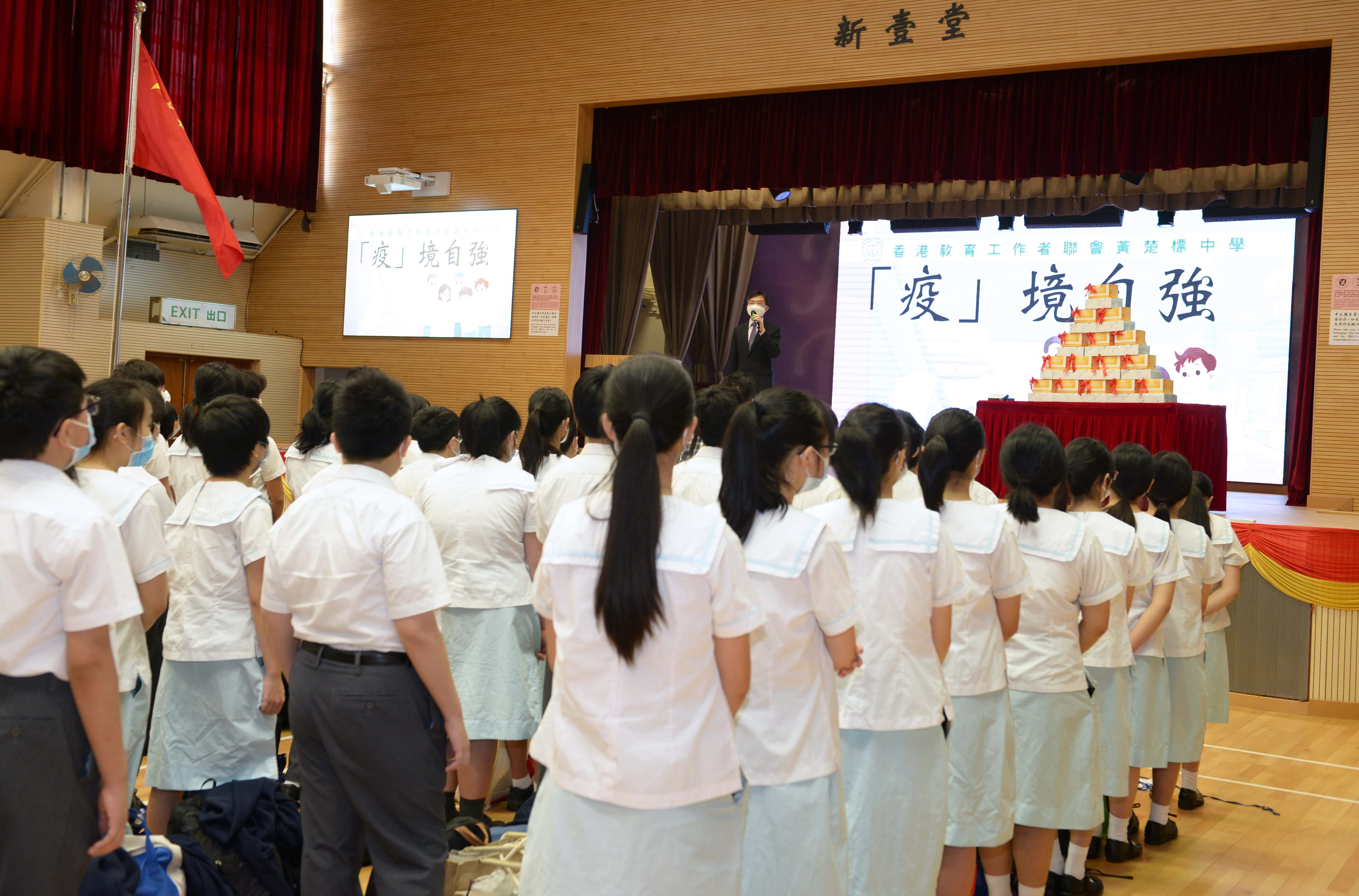 農曆新年過後,第五波疫情肆虐,全港中、小學及幼稚園被逼提早放假。經歷了漫長的特別假期,文憑試核心科目亦完成考核,我們今天終於迎來了期待已久的面授課堂!同學們精神奕奕,齊集禮堂進行升旗儀式。校長在儀式後勉勵同學努力學習,並分享在假期製作的抗疫音樂短片——師生、家長和校友共同演唱歌曲〈鼓舞〉,同時加入手語,鼓勵直播app以至世界各地受疫情影響的人,祝福大家早日走出陰霾,生活重回正軌。校長也為每位師生準備了足夠五月份使用的快速檢測盒,希望能夠減輕同學家庭的負擔。