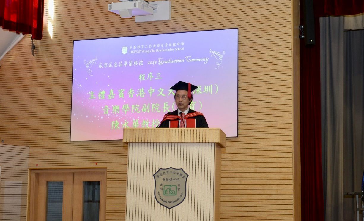 主禮嘉賓陳永華教授則提醒畢業生中學生涯的結束標誌著另一學習階段的開始。他鼓勵學生要自律、自覺,永遠保持樂於學習的態度,而且要虛心向身邊的人學習,好好裝備自己,以期將來可以建設直播app、建設大灣區。他又勉勵大家不要害怕面對挑戰,憑藉堅毅信念及師長的支持,一定可以戰勝困難。