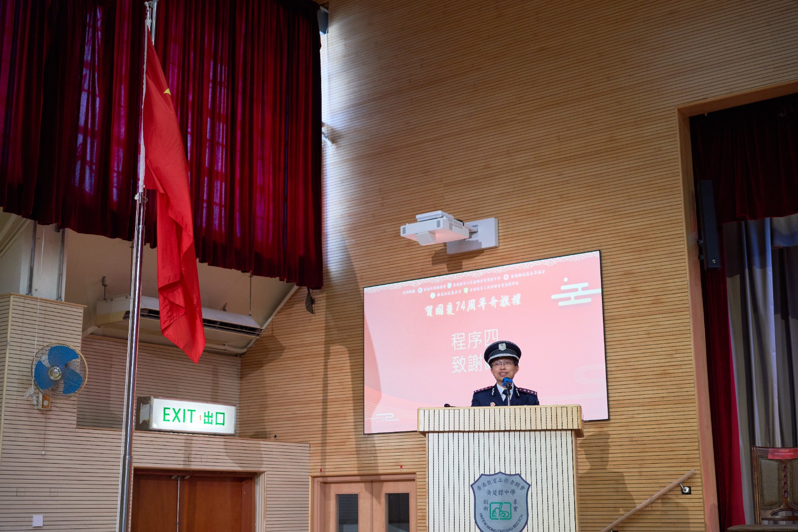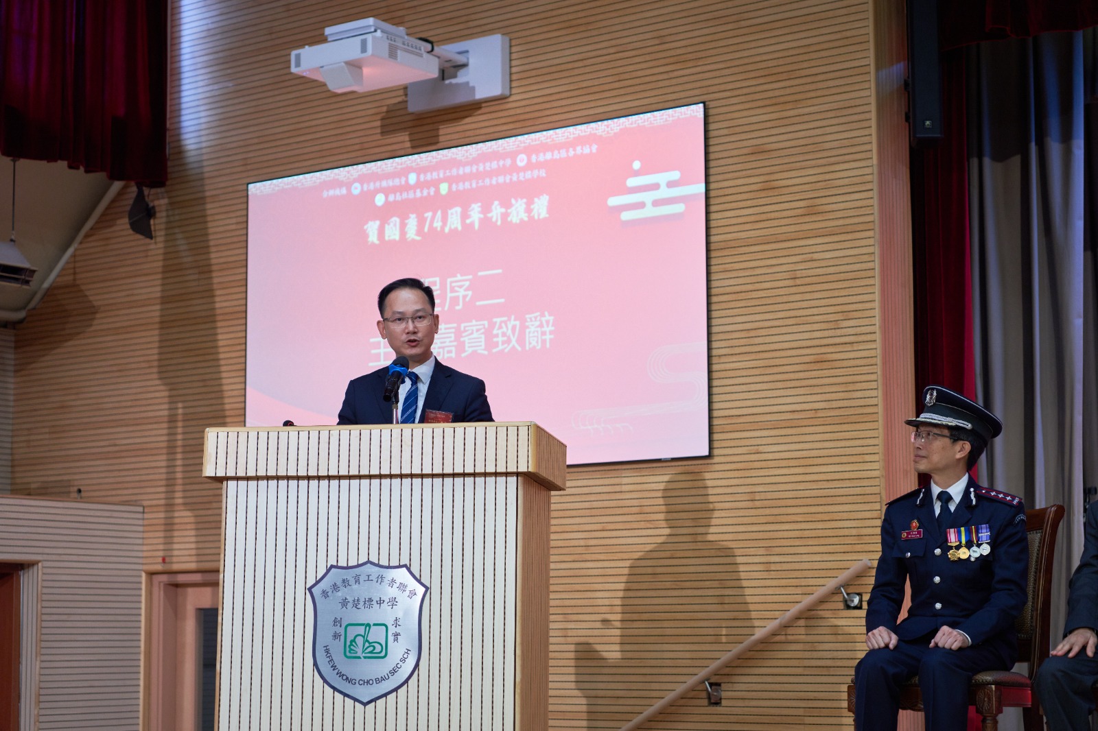 許振隆校長致辭時表示,是次黃楚標中學及黃楚標學校與多個社區團體共同慶祝中華人民共和國成立74周年升旗禮,將進一步凝聚學界及社區不同持分者的力量,讓學生於國慶的喜悅中增強對祖國近年迅速發展和輝煌成就的認識,弘揚以愛國愛港為核心、與「一國兩制」相適應的主流價值觀,同心引領學生深刻認識國家和世界發展大勢,培養他們成為有質素的新一代,將來為國家發展作出貢獻。