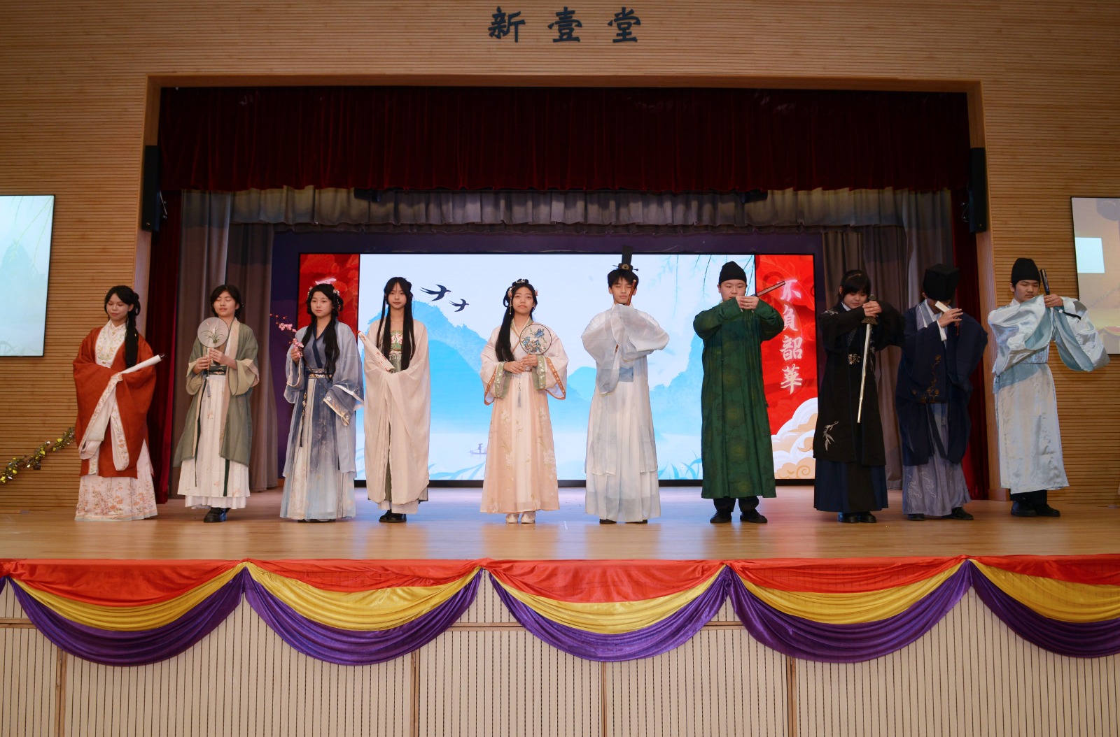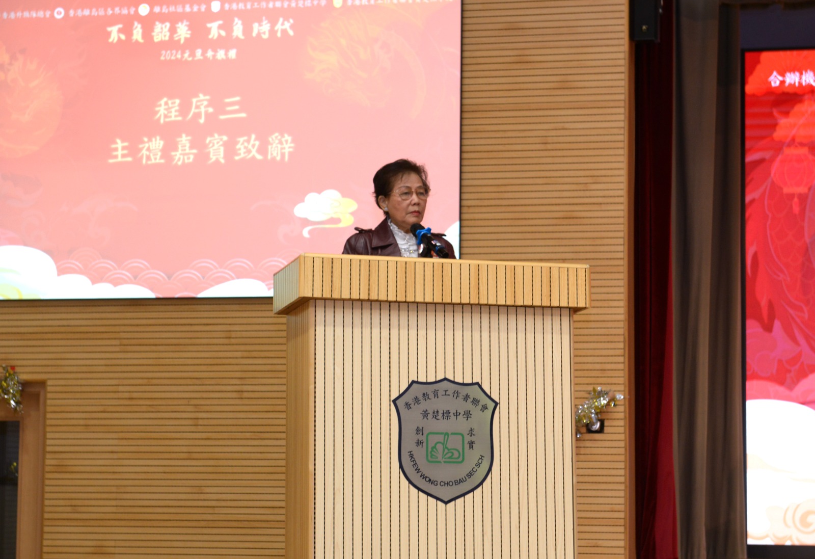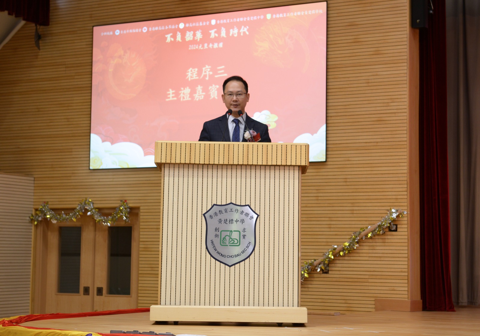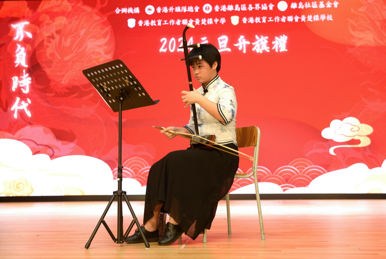 教聯會黃楚標中學一向重視弘揚傳統文化,並鼓勵學生積極發展不同的興趣愛好。典禮上,學生向來賓展現了他們的學習成果,當中的二胡獨奏《戰馬奔騰》,描寫騎兵戰士保家衞國,無懼艱苦,呈現他們勇敢出眾的戰鬥精神,希望新的一年大家龍馬精神;「盛世華服賀元旦」則由學生穿着不同朝代的華服伴隨詩歌出場,每朝的華服都各具特色,充份展現我國璀璨而華麗的服飾文化。該校兩位學生代表說出了年青人的願望——3B陳奕熹勉勵同學感恩和孝敬父母,祝願所有來賓身體健康、事事順利;3E劉嘉雯祝願同學們積極參與學校多姿多彩的活動,在不同學習經歷中獲取新體驗,培養「奮進擔當」的精神,立志成為對社會、對國家有承擔的年青人。學生代表的講話,獲得全場來賓如雷掌聲。