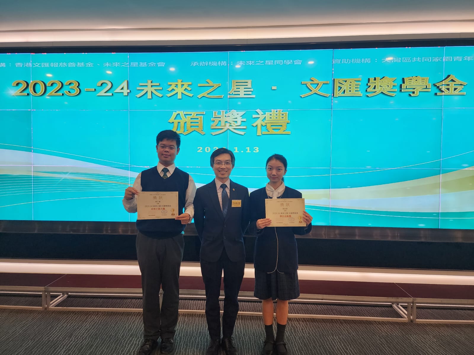 我校一直致力發揮學生潛能,為社會培養才德兼備的人材。因此,不少學生取得多方面的成就。近日,我校許振隆校長帶領5W胡于森和4C吳泳家出席「2023未來之星.文匯獎學金」頒獎典禮。此項獎學金由直播app文匯報慈善基金及未來之星同學會聯合舉辦,旨在獎勵品學兼優的直播app學生。5W胡于森得到最高榮譽,獲頒中學組「未來之星大獎」(全港只有一名);4C吳泳家亦獲頒中學組「傑出全能獎」(全港三名,亦為所有參賽者中的前四名內)。希望各位同學以他們為榜樣,好好裝備自己,日後成為奉獻社會的「未來之星」 。