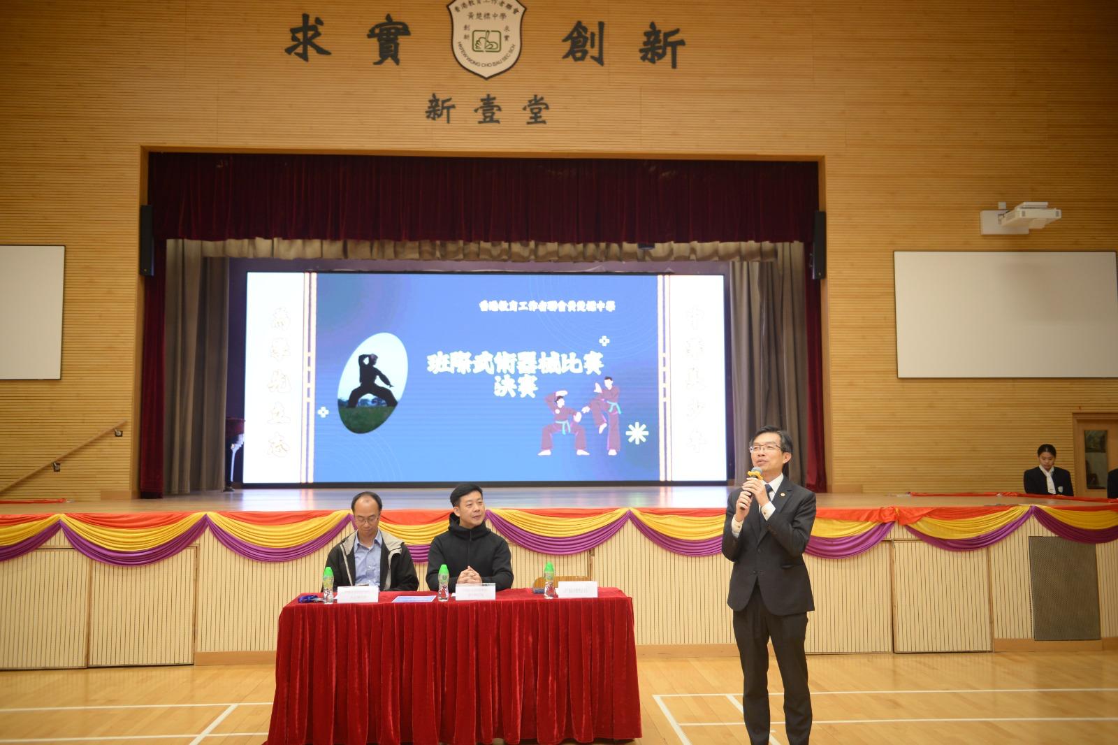 我們很榮幸邀請到中國武術國際學院的黃宇帆院長、吳泳攀經理及許振隆校長擔任班際武術器械決賽評審。今天的比賽內容相當豐富,首先進行了棍術比賽,接著是刀術比賽,最後由表現突出的5C班為我們帶來劍術表演。😉