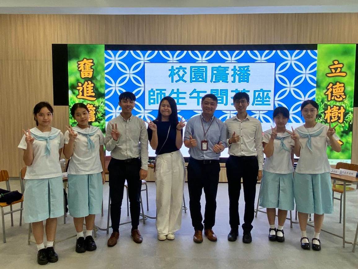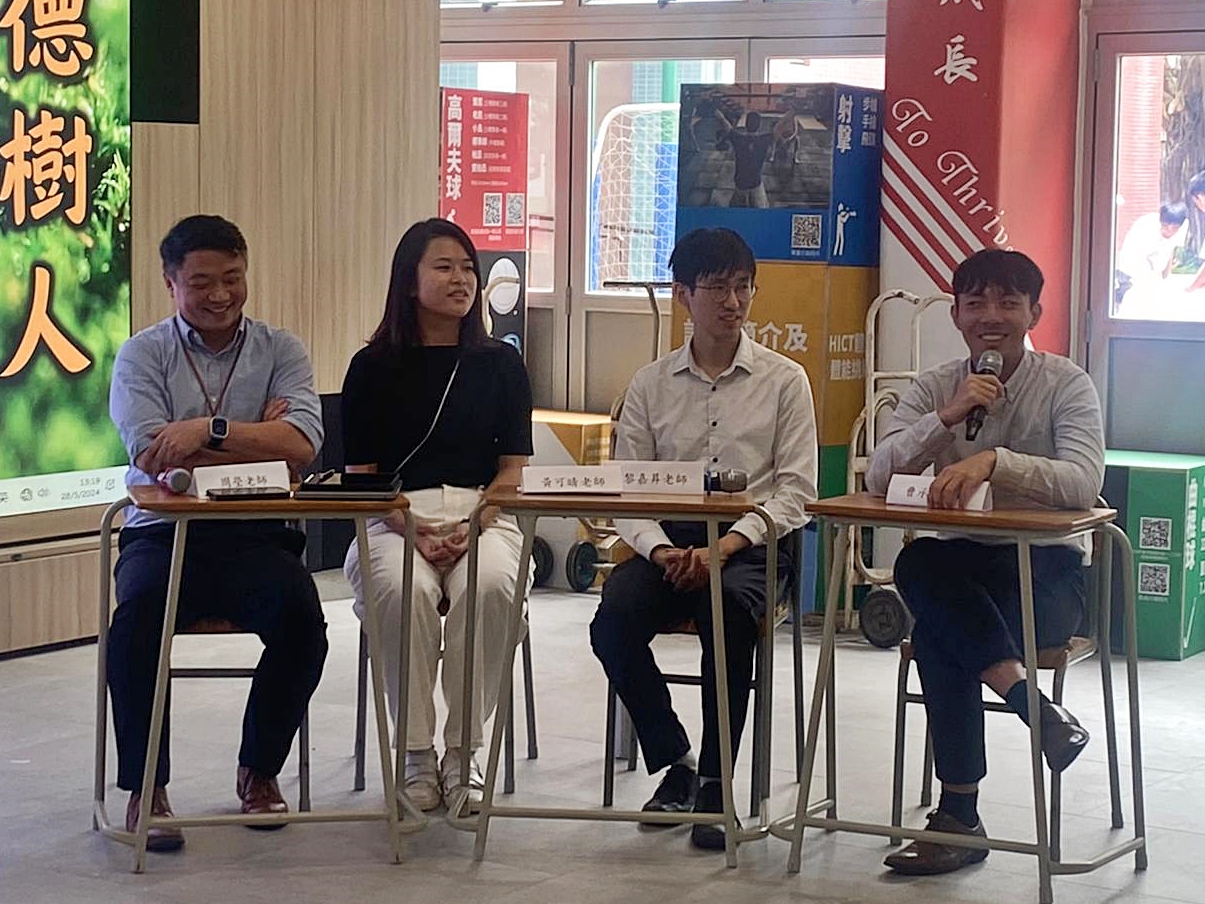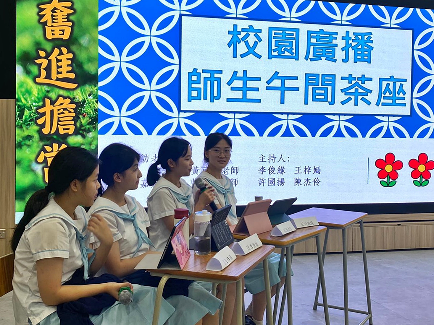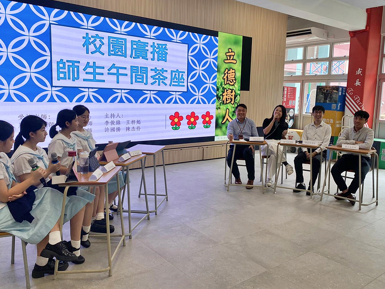 今天,校園廣播在午膳時間舉辦了「師生午間茶座」訪談節目,是次訪談節目邀請了周瑩主任、黃可晴老師、黎嘉昇老師及曹承道老師擔任嘉賓,與一眾學生主持人、觀眾分享教學及生活趣事。學生主持人妙語連珠,氣氛熱鬧,歡笑聲此起彼落。透過是次活動,學生不但能提升演說能力,更能增強自信心,可謂獲益良多。