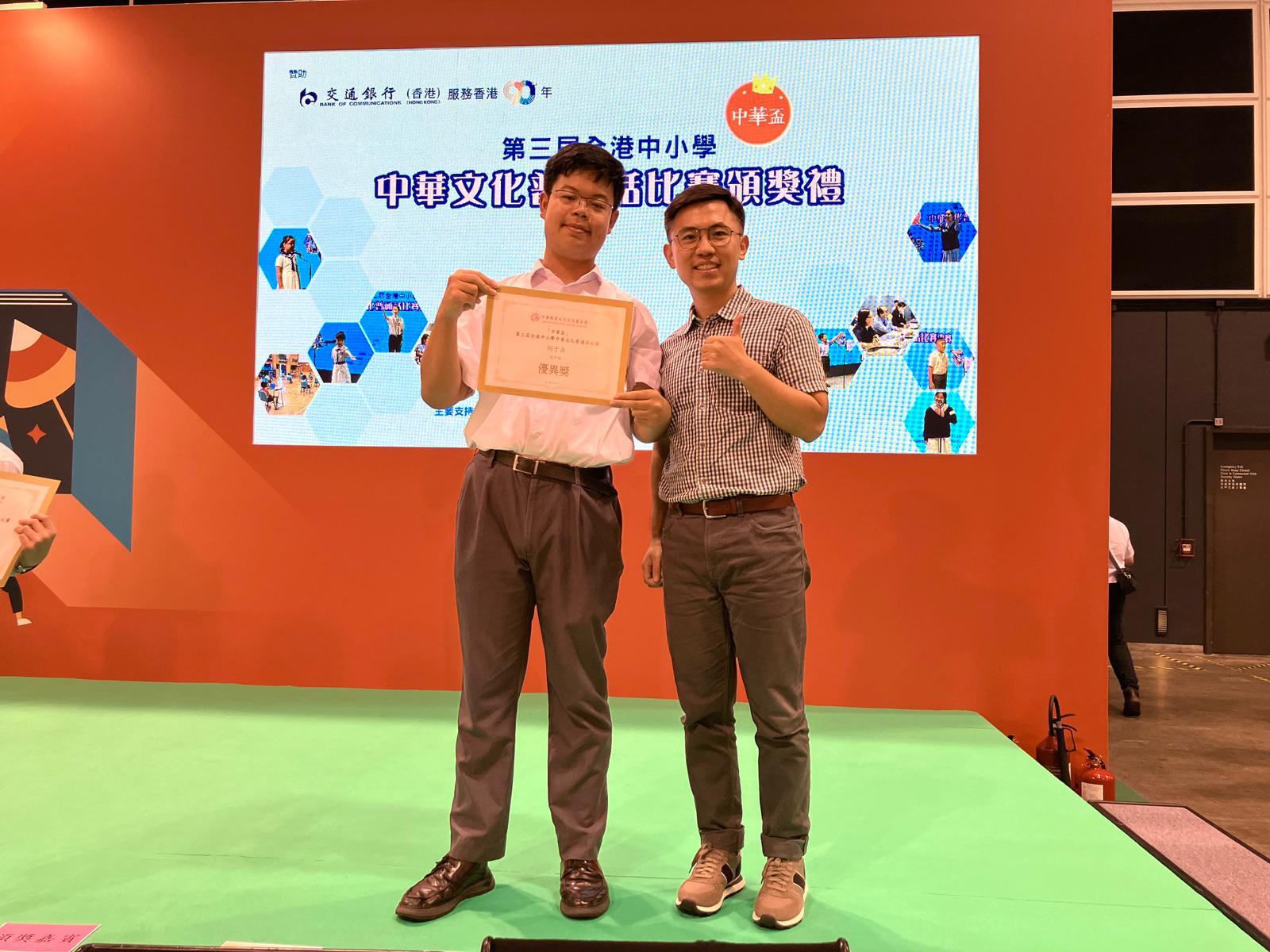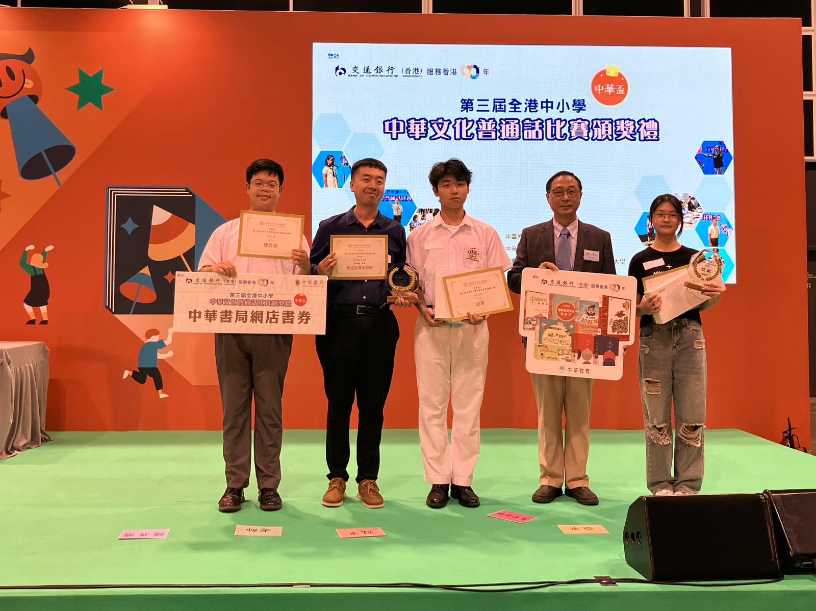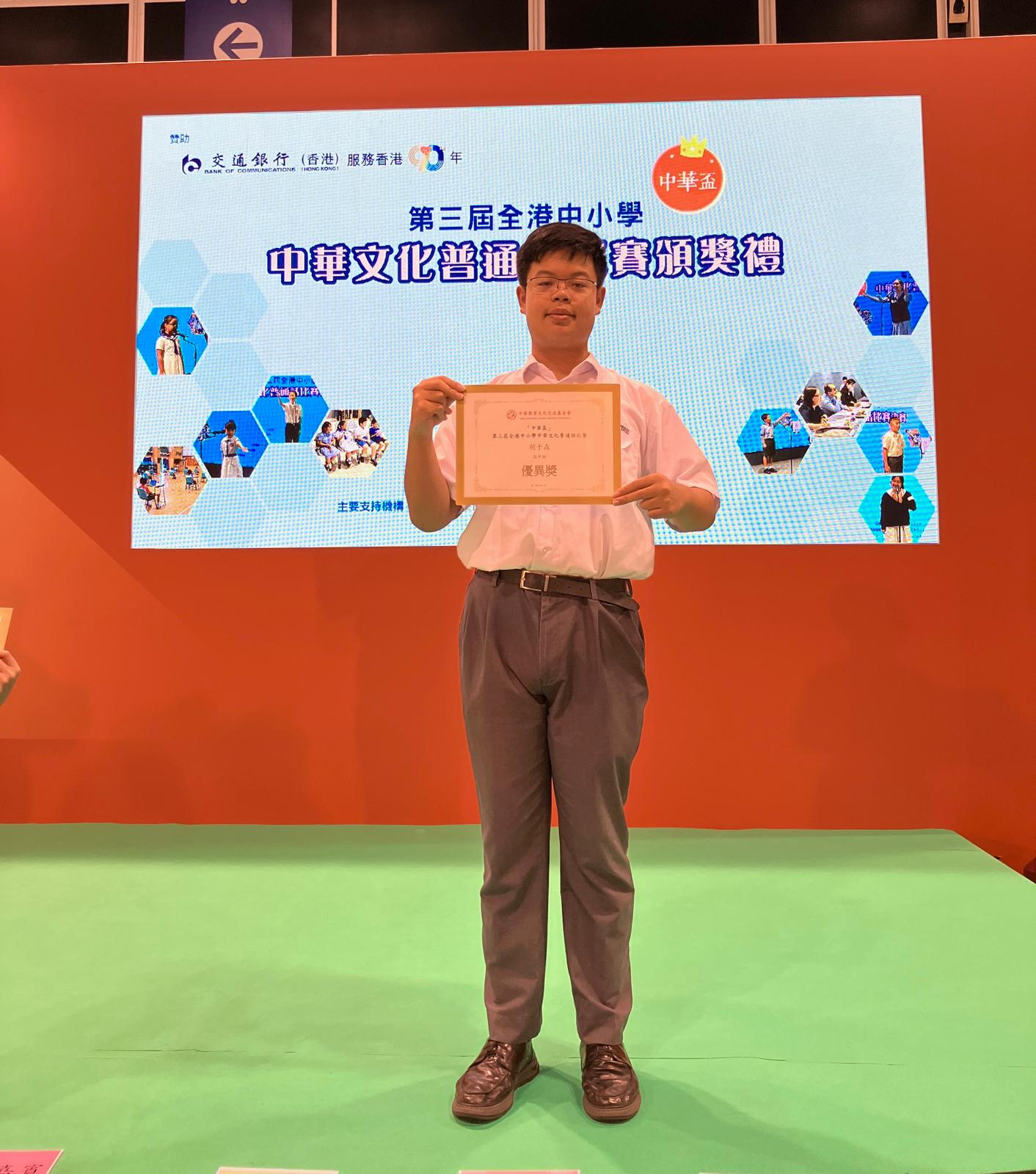 我校近十位學生在5月參加了「第三屆全港中小學中華文化普通話比賽」,其中胡于森同學在700位初賽參賽者中成功晉級決賽,最終獲得優異獎的殊榮。今日有幸在直播app書展參加頒獎典禮,榮譽得來不易,不但是對個人努力的肯定,也促進同學積極學習普通話和中華文化!