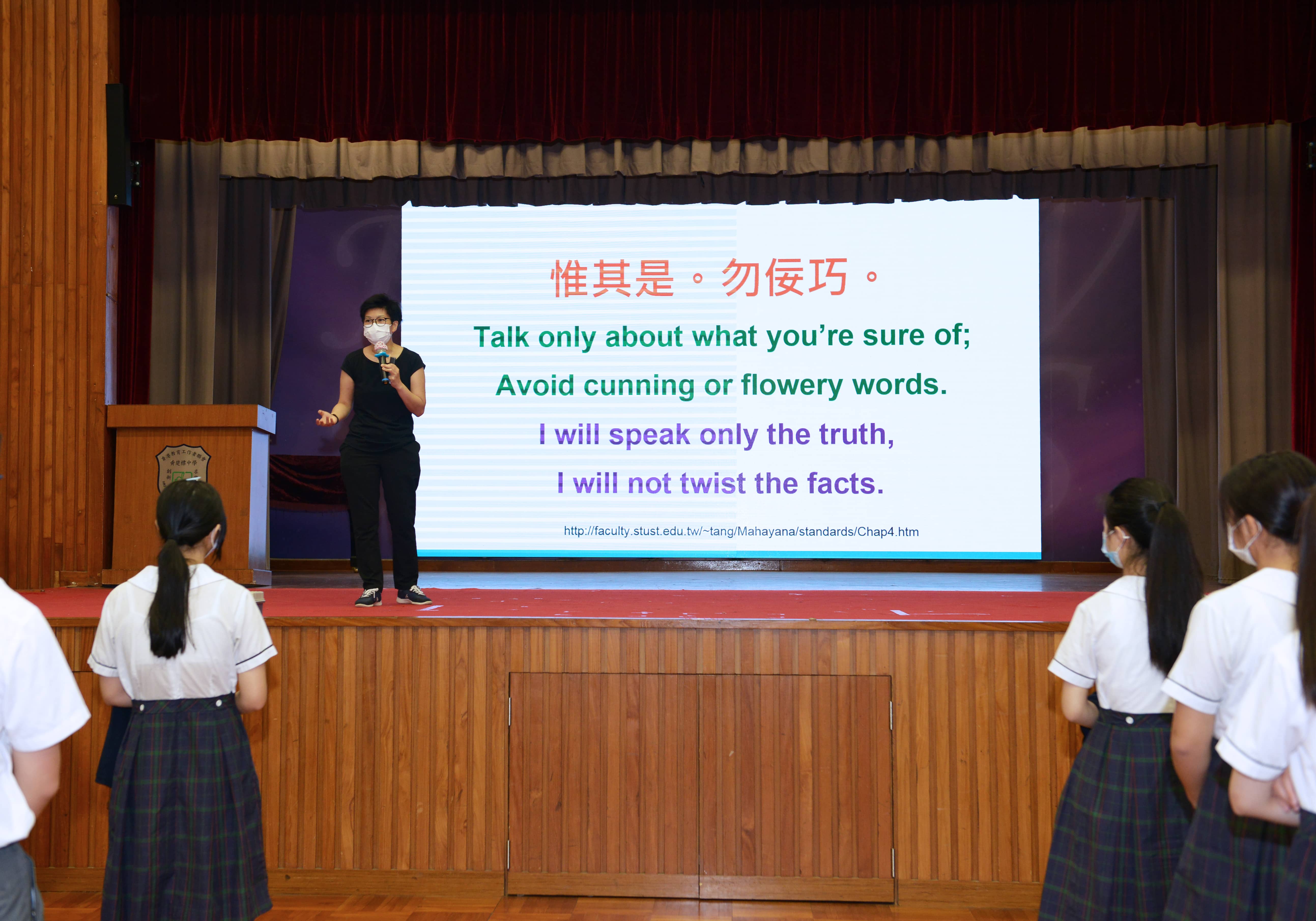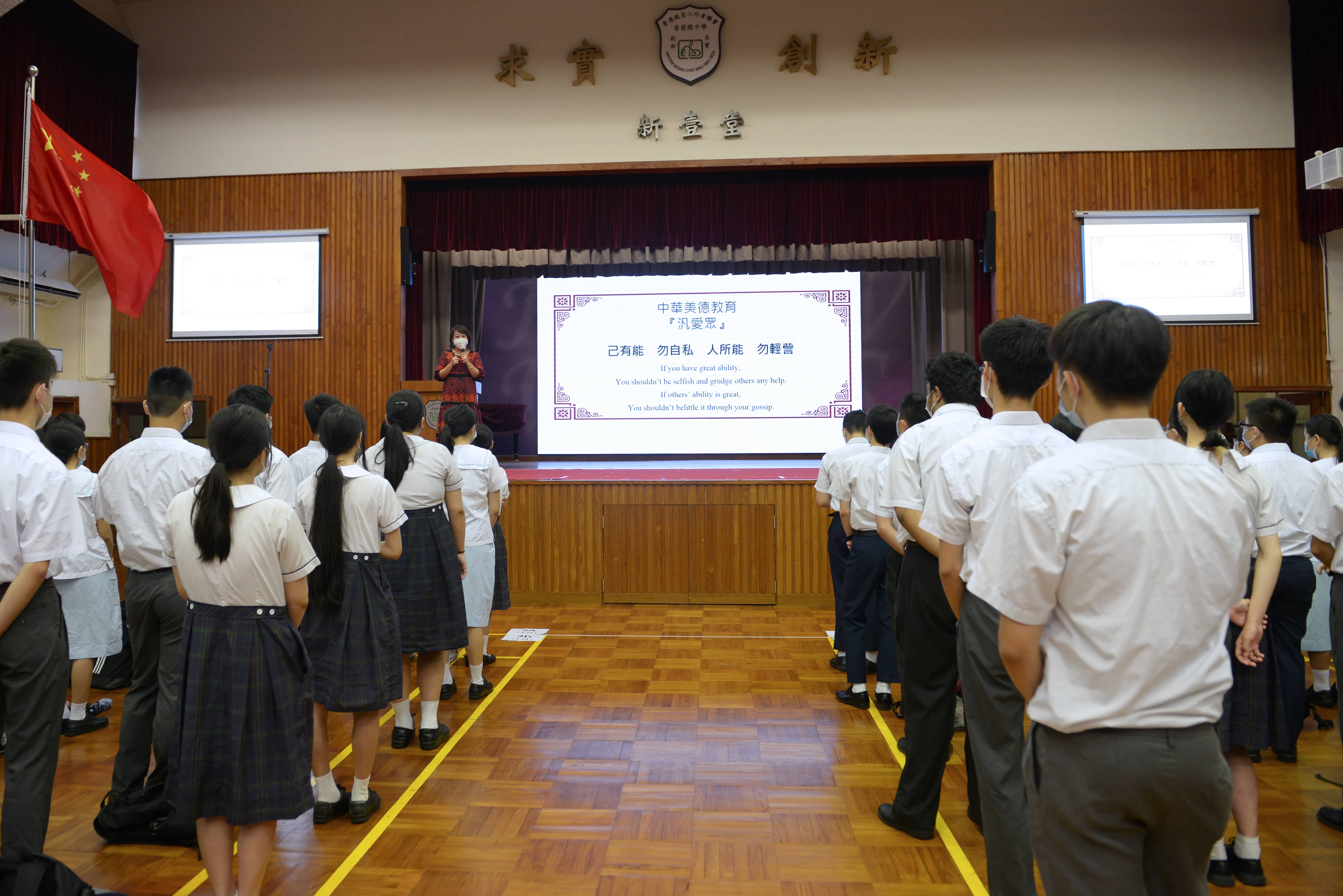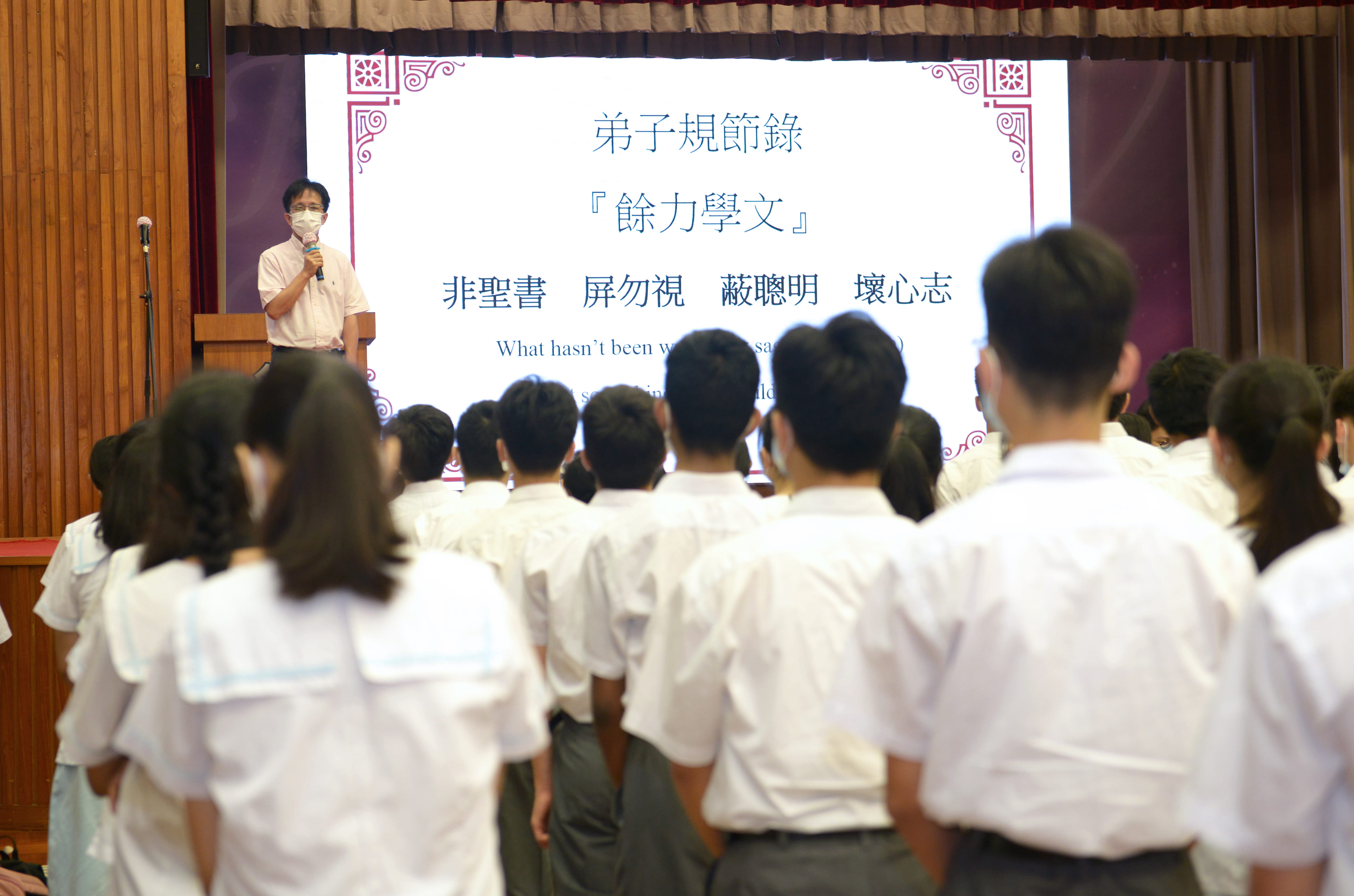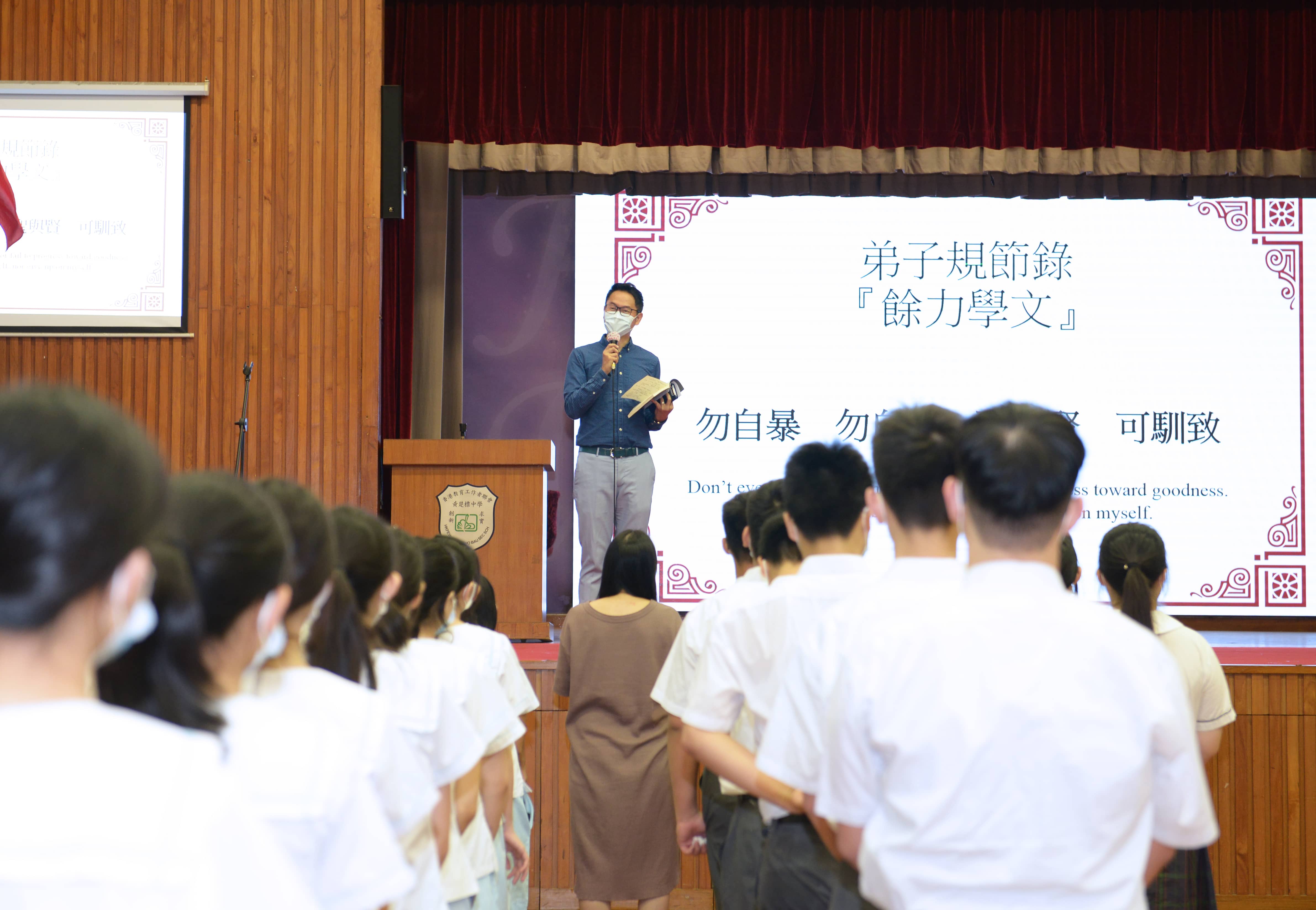 每週星期二、四的早會,我們的老師會在禮堂上分享中華經典蒙學作品《弟子規》的語錄。《弟子規》以三字一句,兩句一韻的文體方式編撰而成,列舉出為人子弟在家、出外、待人接物、求學等應有的禮儀與規範,特別講求家庭教育和生活教育。其核心思想是孝、悌、仁愛與學文。