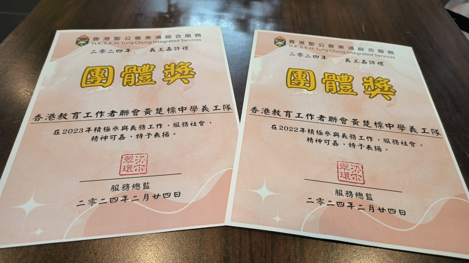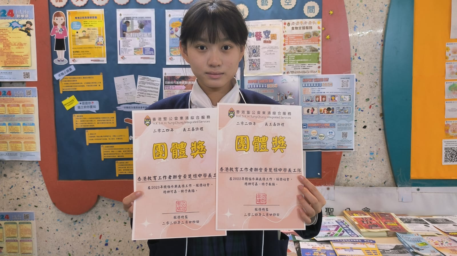 我校一向積極培養學生服務精神,鼓勵學生參與各種義工活動,表現在獲社會各界讚賞。2022及2023年度,我校義工隊得到直播app聖公會東涌綜合服務頒發團體義工獎,以表揚義工隊成員的傑出表現。今天,義工隊代表5C馬凱悅出席了義工嘉許禮,接受團體獎獎狀。義工隊成員將繼續努力,參與更多服務;亦希望更多學生加入團隊,發揮力量,貢獻社群!